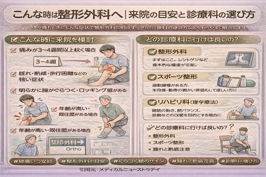 ロッキング(膝が急に動かなくなるような症状)がある場合も、整形外科での検査がすすめられています。