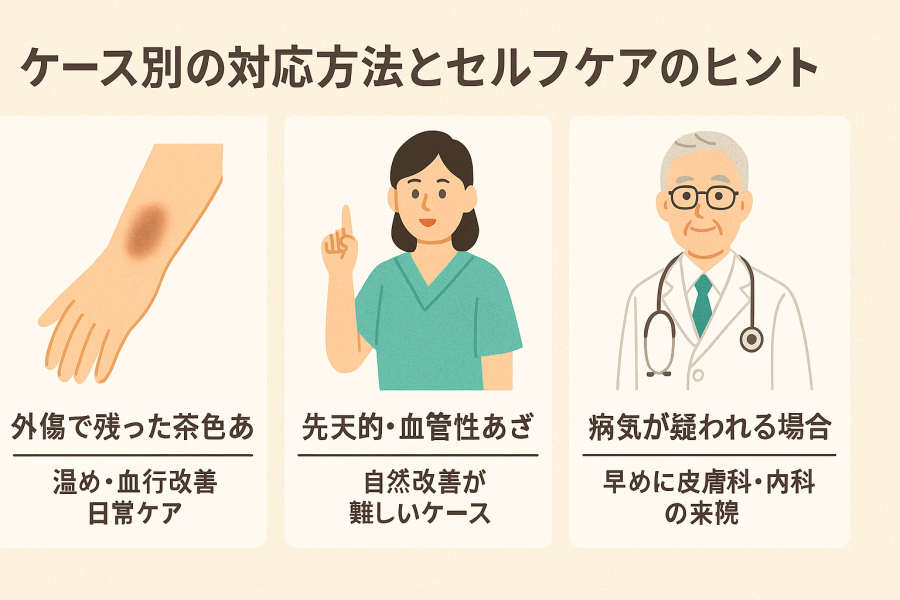 ここでは、「外傷による色素沈着」「先天的・血管性あざ」「病気が関係するケース」の3つに分けて、それぞれのセルフケアや注意点を整理します。