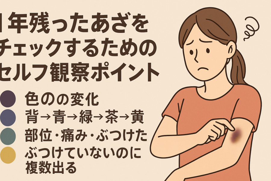 ただし、長引くあざの中には体からのサインが隠れていることもあるため、定期的なセルフチェックが大切です。