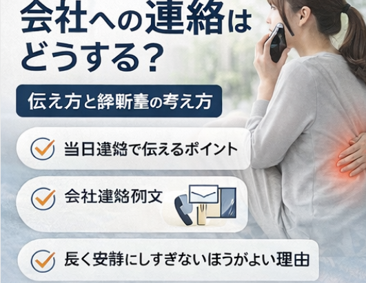 ぎっくり腰 会社休むと決めたら、できるだけ早めに連絡したいですね。伝える内容はシンプルで大丈夫です。「朝から急な腰の痛みが強く、通勤と通常業務が難しいため本日はお休みをいただきたいです。必要に応じて医療機関にも相談します」といった形で、症状と勤務困難の理由がわかれば十分なことが多いです。細かく説明しすぎるより、出勤が難しいこと、連絡が取れるか、明日以降の見通しがまだ不明かを簡潔に伝えるほうが実務的です。