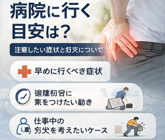 在宅勤務が選べるなら、通勤負担を減らしながら様子を見る方法もあります。時短勤務や軽作業への変更ができる職場なら、最初の1〜2日は段階的に戻す考え方も現実的です。こまめに姿勢を変える、短時間の歩行を入れる、痛みが強くなる前に休憩する。こうした工夫を入れることで、無理のない復帰がしやすくなります。復帰後に再び悪化するようなら、自己判断で押し切らず、医療機関へ来院して相談したいところです。