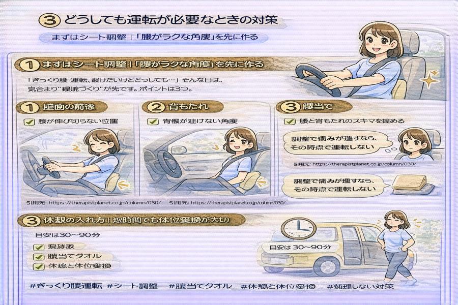 それと、痛む方向の動きを「慣らそう」と繰り返すのは逆効果になりやすいので注意。たとえば、振り向くのがつらいのに何度も確認動作をする、同じ姿勢で腰を反らす…みたいなやつですね。必要ならミラー調整や同乗者のサポートも選択肢になります。