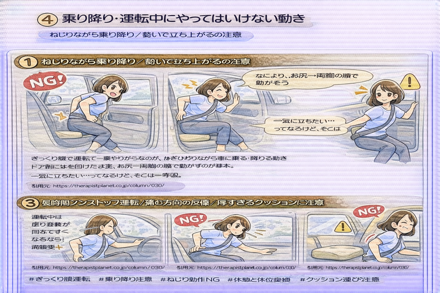 • 長時間ノンストップ運転、痛む方向の反復、厚すぎるクッションなど