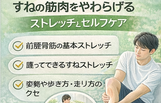 おすすめは、筋トレだけ、ストレッチだけに偏らないことです。張りやすい方は、まずやさしく伸ばしてから軽く働かせる流れのほうが取り入れやすいことがあります。すねの筋肉は、柔らかさと使いやすさの両方が大切なので、ケアとトレーニングをセットで考えると続けやすいです。