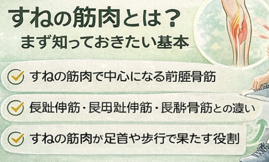 すねの筋肉と聞いて、まず中心になるのが前脛骨筋です。前脛骨筋は、すねの前側にある代表的な筋肉で、足首を上に持ち上げる動きに深く関わると言われています。歩くとき、つまずかないようにつま先を上げたり、階段を上るときに足を運びやすくしたりする場面でも働きやすいんです。「すねの前が張る」「歩くとだるい」と感じる方は、この前脛骨筋が関係していることがあります。