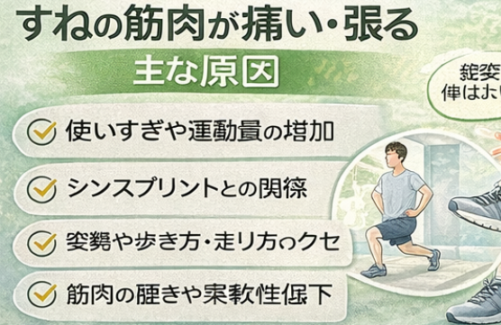 使いすぎだけでなく、歩き方や走り方のクセ、足首の硬さ、足裏のバランスの崩れが重なることで、すねの筋肉に負担が寄りやすくなることもあります。フォームが乱れていると、一部の筋肉だけが頑張りすぎる形になりやすいんですね。特に片側だけ張るときは、体の使い方も見直したいところです。