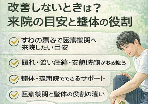 医療機関は、強い痛みや腫れ、安静時痛など、注意したい症状がないかを確認する役割があります。一方で整体・施術院は、姿勢やフォーム、筋肉の使い方を見直すサポートをしやすい場です。どちらがよいかを一つに決めるより、症状の強さに合わせて考えるほうが安心です。改善しないときや不安が強いときは、まず医療機関へ来院する流れをおすすめします。