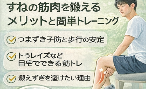 ただ、すねの筋肉は使いすぎでも張りやすいため、鍛えれば鍛えるほどよいとは限りません。とくにランニングや立ち仕事で日常的に負荷がかかっている方は、筋トレだけ増やすと疲れが抜けにくくなることがあります。大切なのは、足りない刺激を少し足す感覚で続けることです。