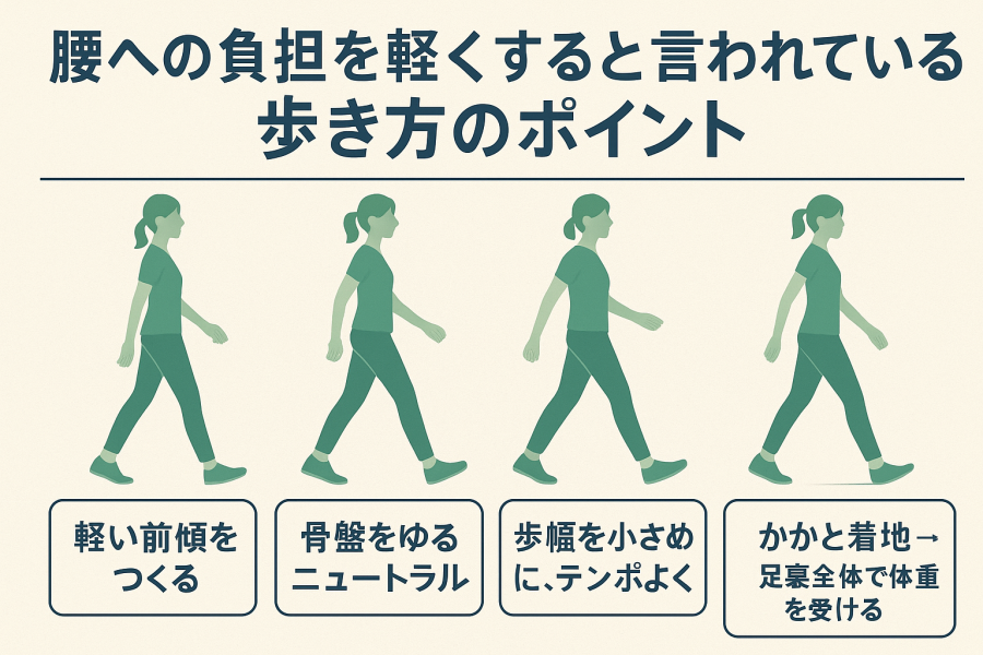 つま先から着地すると腰が反る姿勢になりやすいため、かかと→足裏全体の順に体重を乗せる歩き方がすすめられることが多いです。