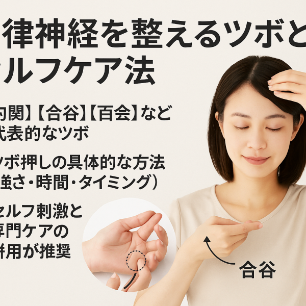 ただし、セルフケアだけで十分な改善が見られない場合は、鍼灸院や整体といった専門ケアを取り入れることも有効とされています。鍼灸ではツボを的確に刺激でき、整体では首や肩の筋緊張を緩めて血流を促すアプローチが行われます。セルフと専門ケアを併用することで、自律神経の安定につながりやすいと考えられています。