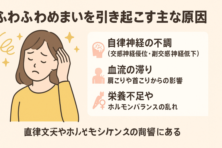このふわふわめまいは、耳の平衡感覚の異常と並んで「自律神経の乱れ」と深く関わっていると考えられています。ストレスや不眠、過度の疲労などで自律神経のバランスが崩れると、血流や酸素供給が不安定になり、脳や内耳に十分な循環が行き届かなくなることがあります。その結果、体が傾いたように感じたり、ふらつきにつながると言われています(引用元:https://www.krm0730.net/blog/3138/)。