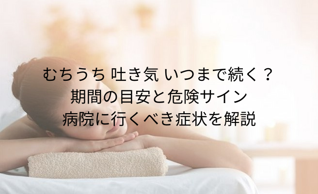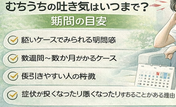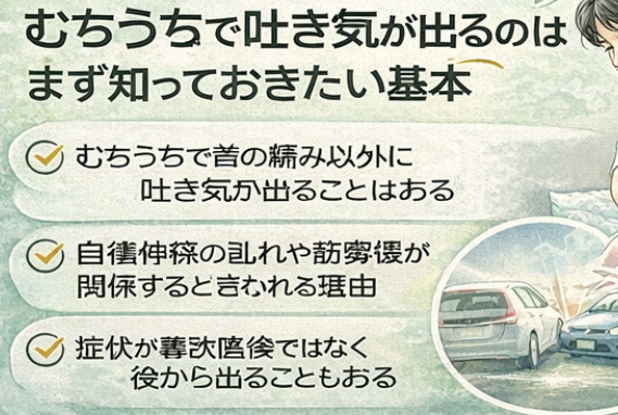 一方で、吐き気だけでなく頭痛やめまい、首の動かしづらさが重なっている場合は、数週間から数か月かかるケースもあります。むちうち全体としては2〜3か月ほどで改善していくことが多いと案内されることがありますが、症状が長引く方もいます。吐き気が続くときは、単に「長いな」で済ませず、経過を医療機関で見てもらうことが安心につながります。