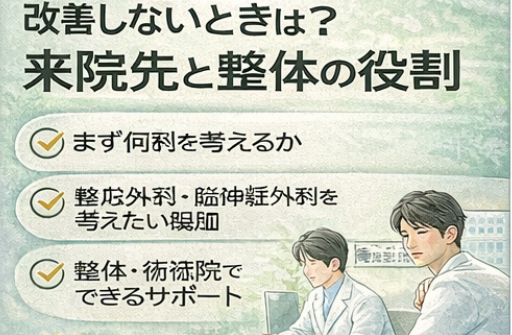医療機関は、危険な症状がないかを確認し、必要な検査へつなぐ役割があります。一方で整体・施術院は、筋肉の緊張や体の使い方を整えるサポートをしやすい場です。どちらか一方だけで考えるのではなく、症状の強さに応じて順番を考えることが安心につながります。むちうち 吐き気 いつまでと迷うときは、まず医療機関で安全確認をしてから次を考える流れがおすすめです。