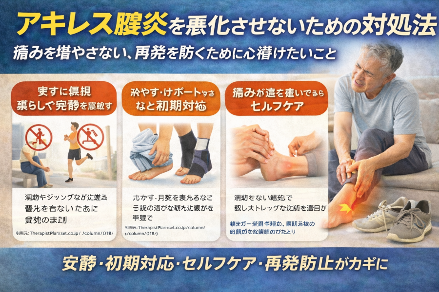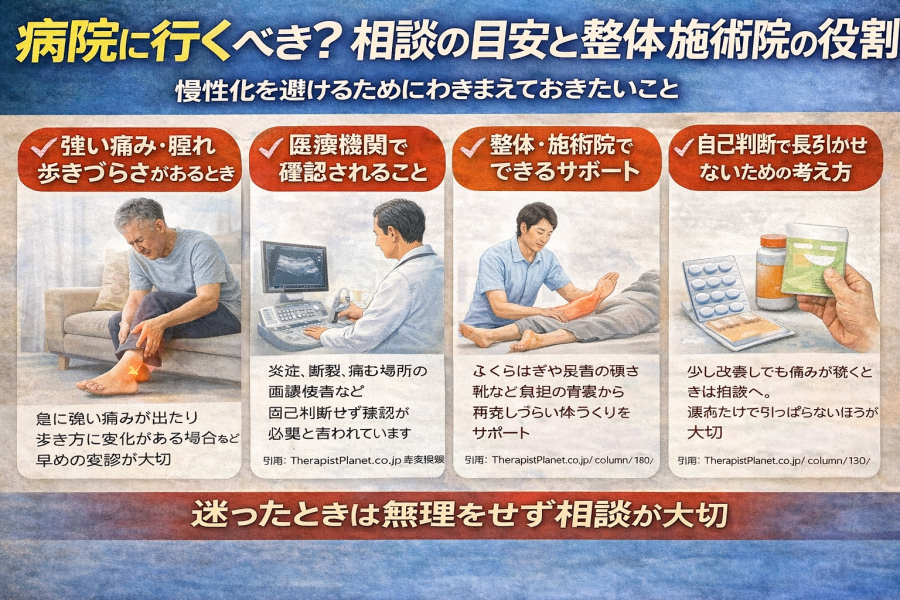 一方で、参考記事ではアキレス腱炎の背景として、使いすぎ、加齢、靴、体の使い方などが挙げられています。そのため、整体・施術院では、痛い場所だけを見るのではなく、ふくらはぎの硬さ、足首の動き、歩き方、靴の影響、日常で負担が集まりやすい動きを整理するサポートが考えられるようです。医療の代わりに病気を判断する場所というより、負担のかかり方を見直し、再発しにくい体の使い方を考える場として活用されることがあると言われています。
