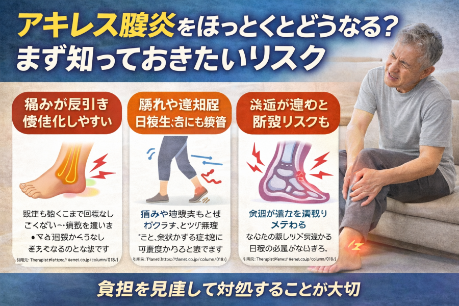参考記事では、放置すると慢性的な痛みにつながったり、重い場合は断裂リスクもあると書かれています。さらに、医療情報では強い痛みや腫れがある、歩くのがつらい、体重をかけにくいといった状態は、早めに確認したい目安として案内されています。とくに急に強い痛みが出たときや、歩き方が明らかに変わるときは、軽く見すぎないことが大切と言われています。