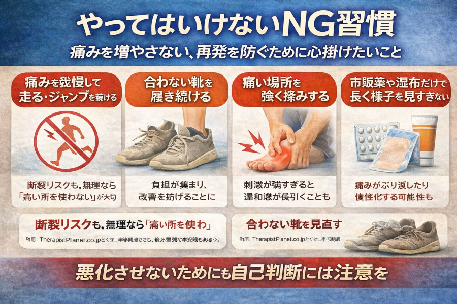 とくに痛みが出始めた直後は、炎症が強くなりやすい時期とされており、無理に走る、ジャンプする、階段をくり返すといった動きは控えるほうがよいようです。Therapist Planet の別記事でも、痛みがあるのに運動や歩行を続けると炎症が進み、慢性化しやすくなる可能性があると説明されています。まずは「動かして改善を狙う」より、「悪化させないために休ませる」ことが優先と言われています。