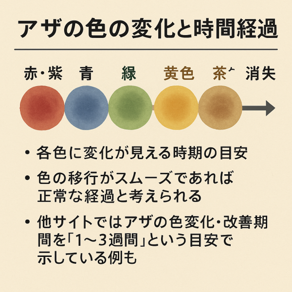→ 他サイトではあざの色変化・治癒期間を「1〜3週間」という目安で示している例もあります -