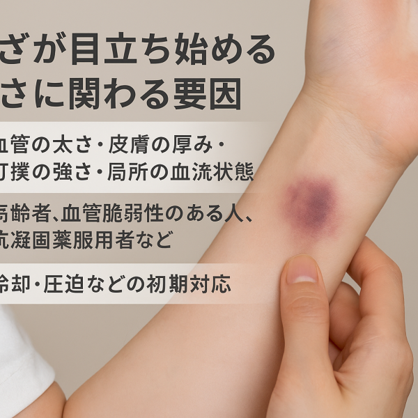→ 打撲後、数分〜数時間であざが視認されるケースと、それに影響する要因(部位・皮膚の薄さ・血管の性質など) -