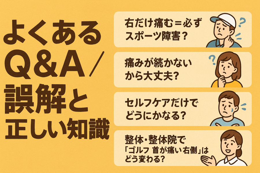 ラウンド後に右の首が重い…そんなときって、「とりあえず湿布貼っとこうかな」みたいになりやすいですよね。でも、ゴルフ特有の“頭を残す”動きや、準備不足、日常での姿勢が影響していることもあると言われています。ここでは、無理なく続けられるセルフケアや習慣をまとめました。難しいことはしないでOKです。「あ、これできそう」と思えるところからで大丈夫です。