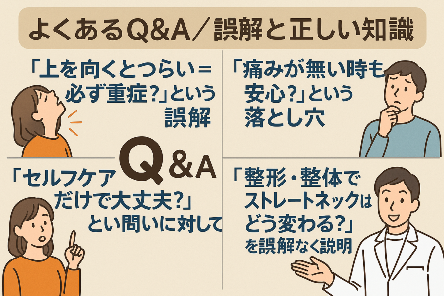 ストレートネックで「上を向くとつらい」と感じると、不安が一気に高まる方も多いです。でも、まずは落ち着いて状況を整理することが大切だと言われています。ここでは、よくある誤解を会話形式でやさしくほどきながら、正しい視点をお伝えしますね。