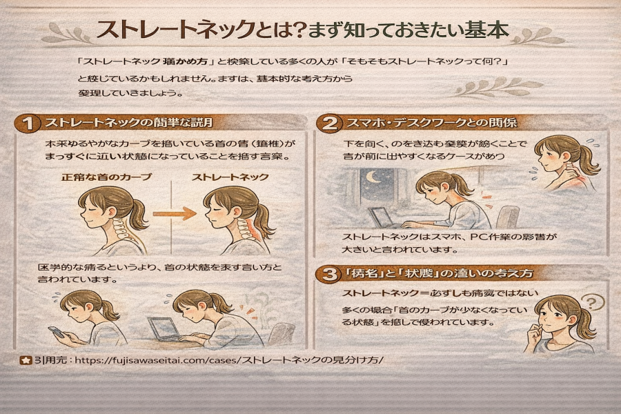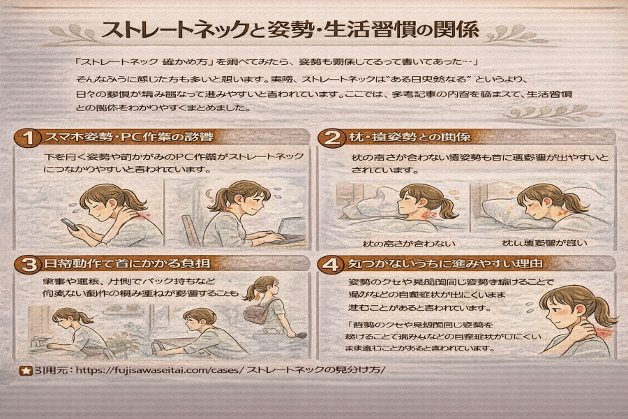長時間うつむいた姿勢や、画面をのぞき込む姿勢が続くと、首が前に出た状態がクセになりやすいようです。その積み重ねが、ストレートネックの状態につながる可能性があると紹介されています。