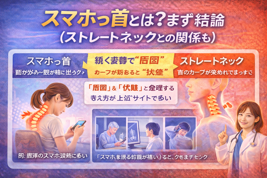 「つまり、スマホ首が続くとストレートネックっぽくなることもある…ってこと?」という質問もありますが、これは断定ではなく、そうした説明のされ方が多い、という理解が安全です。