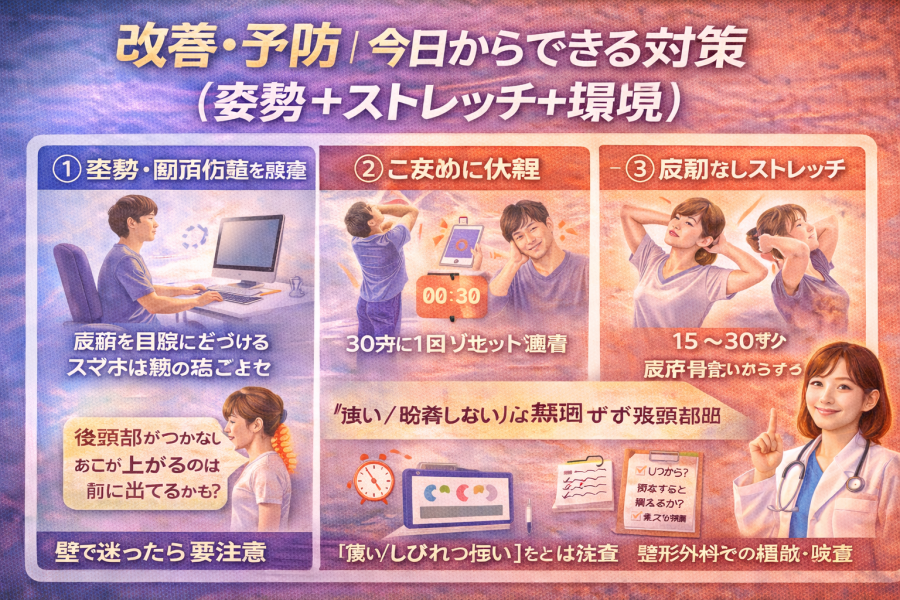 改善・予防|今日からできる対策(姿勢+ストレッチ+環境)
