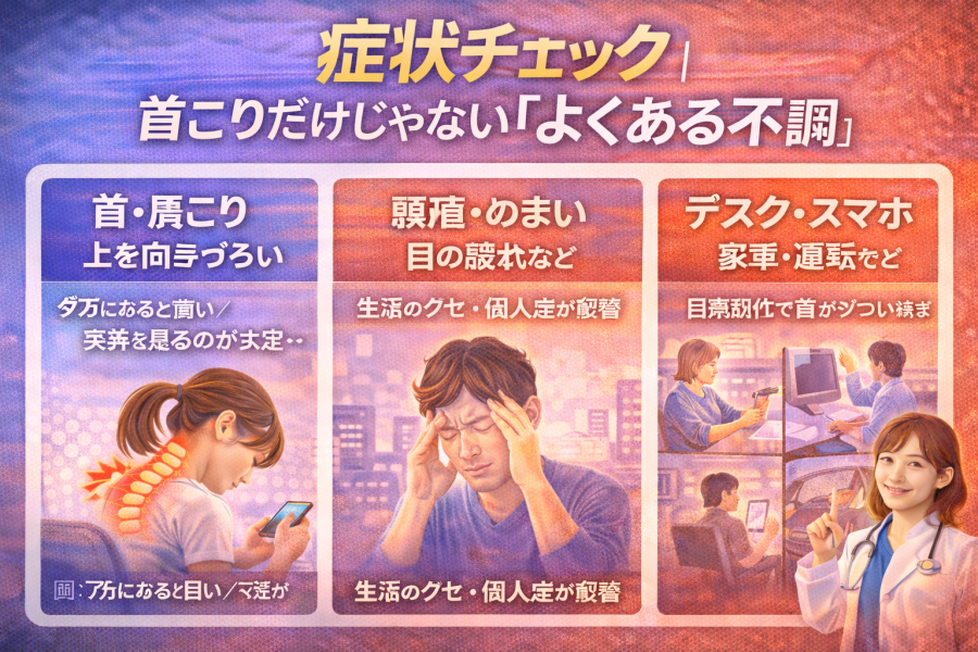 「首こりだけじゃなく、頭が重い」「目がしょぼしょぼする」みたいな不調も話題になります。頭痛やめまい、目の疲れに触れているページもありますが、ここは体調や生活状況でも変わるため、断定は避けて“そう感じる人もいる”くらいで捉えるのが安心です。さらに進むと、手のしびれ感などに触れている解説もありますが、しびれが続く場合は自己判断でがんばらず、医療機関へ来院して相談する流れが一般的と言われています。