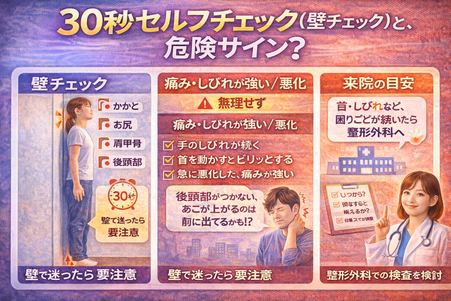 「壁チェックで後頭部がつかない=絶対に危険」とは言い切れませんが、痛みが続く/しびれがある/日常動作がつらいなどの困りごとがある場合は、整形外科で状態を確認し、必要に応じて検査を検討する流れが紹介されています。来院時は「いつから」「何をすると増えるか」「仕事やスマホ時間」をメモしておくと説明がスムーズです。