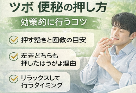 おすすめのタイミングは、入浴後、寝る前、起床後の少し体がゆるんでいる時間帯です。仕事の合間でもできますが、焦っているときや力が入りっぱなしのときは、刺激が雑になりやすいんです。ツボ 便秘のケアは、深呼吸しながら行うと続けやすく、ストレス便秘が気になる方にも向いています。