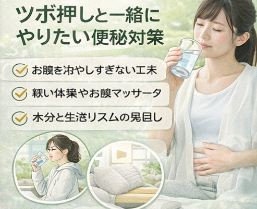 便秘が気になるときは、ツボ押しだけでなく、お腹まわりを冷やしすぎない工夫も大切です。薄着の日が続いたり、冷たい飲み物が多かったりすると、お腹が張りやすいと感じる方もいますよね。腹巻きやぬるめのお風呂など、できることから整えていくと、ツボ 便秘のケアも続けやすくなります。