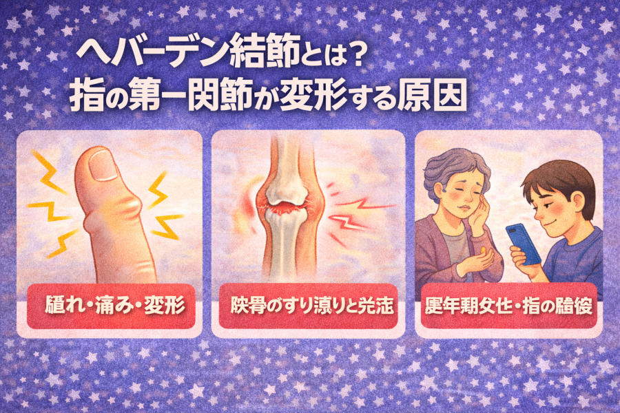 ヘバーデン結節では、指の第一関節に腫れや変形が見られることがあると説明されています。こうした変化が長く続いたり、徐々に目立ってくる場合には、関節の状態を確認するために相談することが考えられると言われています。