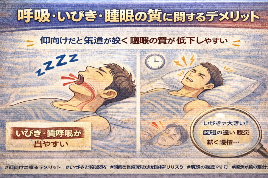 仰向けでは舌が喉側に落ちやすく、気道が狭くなっていびきや睡眠時無呼吸のリスクが高まる可能性があるとする報告もあります。横向き寝の方が呼吸がしやすい人もいる、といった説明が医療系サイトでも取り上げられています。