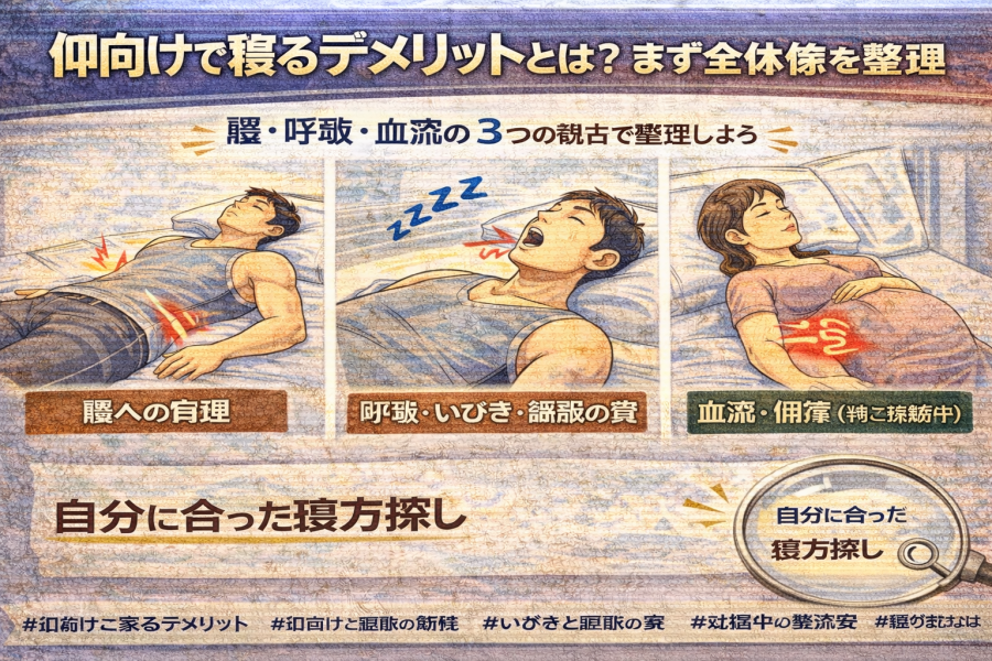 このように、「仰向けが悪い」というよりも、腰・呼吸・血流という三つの観点で、自分にとってメリットとデメリットを整理していくことが大事だと考えられています。