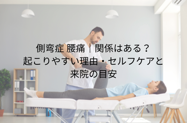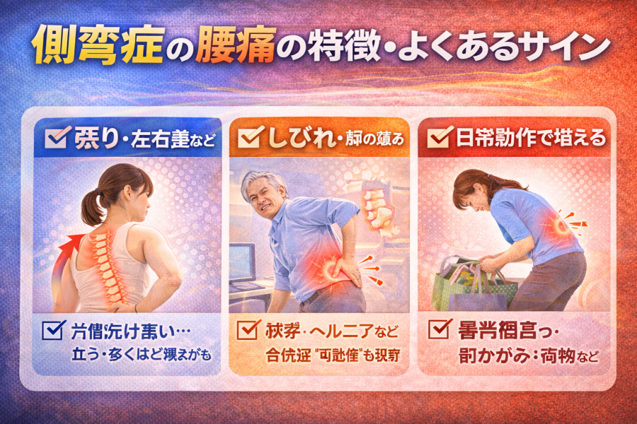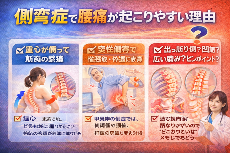 検索上位でよく見るのが、痛みの出方を“パターン分け”する説明です。たとえば、背骨のカーブで出っ張り側(凸側)が張って痛いと感じる人もいれば、反対の凹側が引っ張られてつらい人もいると言われています。さらに、腰全体が重だるい「広い痛み」っぽい場合もあれば、骨盤の上あたりが「ピンポイントで痛い」こともあるようです。だからこそ、「いつ・どの動きで・どこがつらいか」をメモしておくと、来院時に話が早いです。