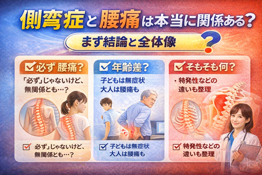 もう一つ、見逃したくないのが「腰だけじゃなく脚まで違和感がある」ケースです。側弯症そのものだけでなく、状態によっては脊柱管狭窄症や椎間板ヘルニアなどが関係して、脚のしびれ感や痛みが出る可能性も語られています。もちろん自己判断は難しいので、しびれが続く、歩くと脚がつらい、力が入りにくい感じがある…といったときは、早めに医療機関へ来院して相談する考え方が一般的と言われています。