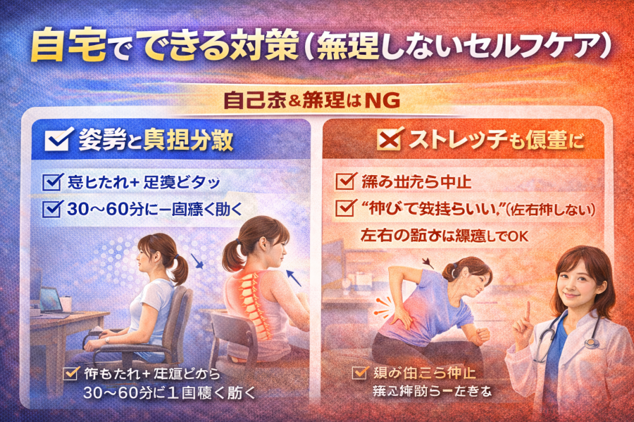 一方で、強い神経症状がなく「張り・だるさが慢性的」「座り方や立ち方で増える」といったタイプは、整形外科で大きな問題の有無を確認しつつ、日常での姿勢・動作の見直しを進める考え方もあると言われています。つまり、医療機関は“状態確認と必要な検査”、日常サポートは“負担のかけ方を整える”という役割分担です。迷ったら、まずは「今困っている動作(長時間座位、前かがみ、荷物など)」をメモして持っていくと話が早いですよ。