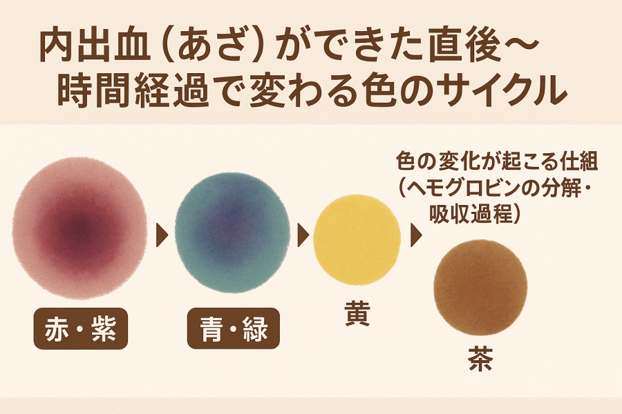 あざ(内出血)の色の変化は、血液中の色素が分解・吸収される過程で起こるとされています。