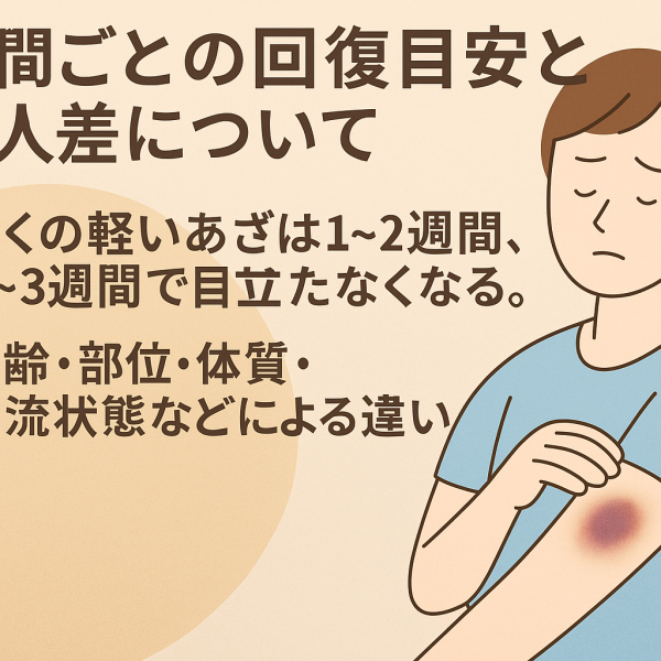 実は、あざの回復スピードには「一般的な目安」と「個人差による違い」があります。ここでは、時間経過での変化と、回復に差が出る要因をわかりやすく整理していきます。