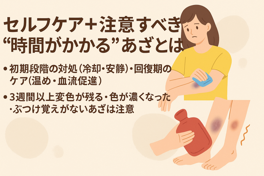 あざ(内出血)は時間とともに自然に薄くなることが多いですが、ケアの仕方や体の状態によって回復に差が出ることもあります。ここでは、自宅でできるセルフケアと、注意が必要な“長引くあざ”の特徴を整理していきます。