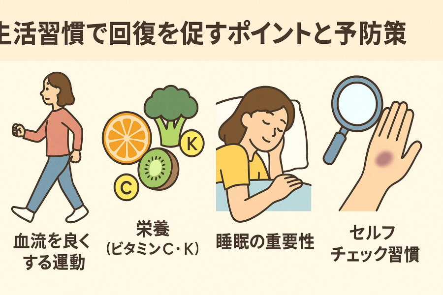 あざ(内出血)は皮下ににじんだ血液が分解・吸収されることで徐々に消えていきますが、そのスピードは血流や栄養状態、睡眠の質によって変わると言われています。ここでは、回復を早めるための生活ポイントと、再発を防ぐための習慣を紹介します。