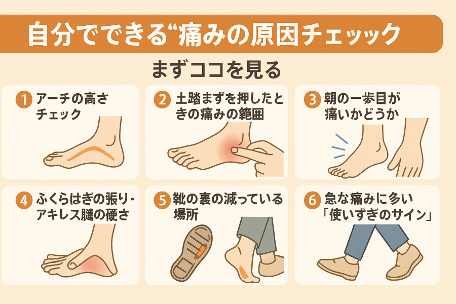 「土踏まずが急に痛くなったんですけど、何を見ればいいですか?」と相談されることがよくあります。そういう時には、まず自分で軽くチェックできるポイントをいくつか確認してみると、負担のかかり方の傾向がつかみやすいと言われています。