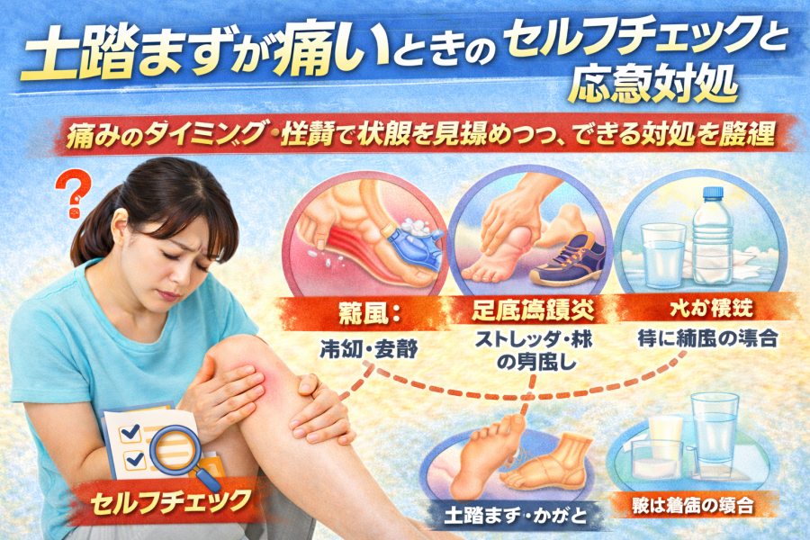 とはいえ、「どちらにも当てはまる気がする…」という声もあります。実際、疲労やアーチの崩れで足底筋膜炎の痛みが強くなることもあれば、尿酸値が高くて軽い違和感が出始めることもあるそうです。こうした背景が重なることもあるため、痛みの経過を少し丁寧に観察していくと、自分の状態が整理しやすくなりますよ。