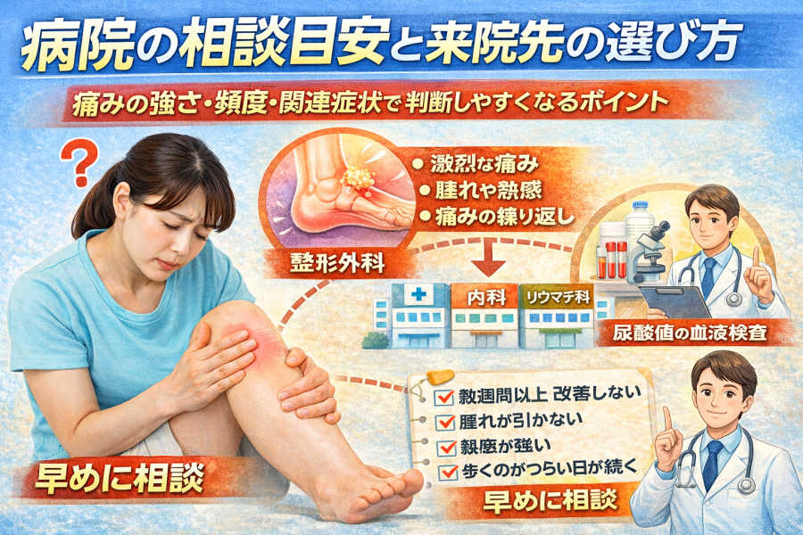 また、痛みが何度も繰り返す場合も一つのサインだと紹介されています。「数日で落ち着くけれど、またしばらくして痛み始める」などの循環が続くと、足裏の負担だけでなく尿酸値や関節の状態が関係している可能性もあると言われています。同じ場所に何度も痛みが出るのか、発作のように急に来るのかを振り返ると、相談するときの材料になりますね。