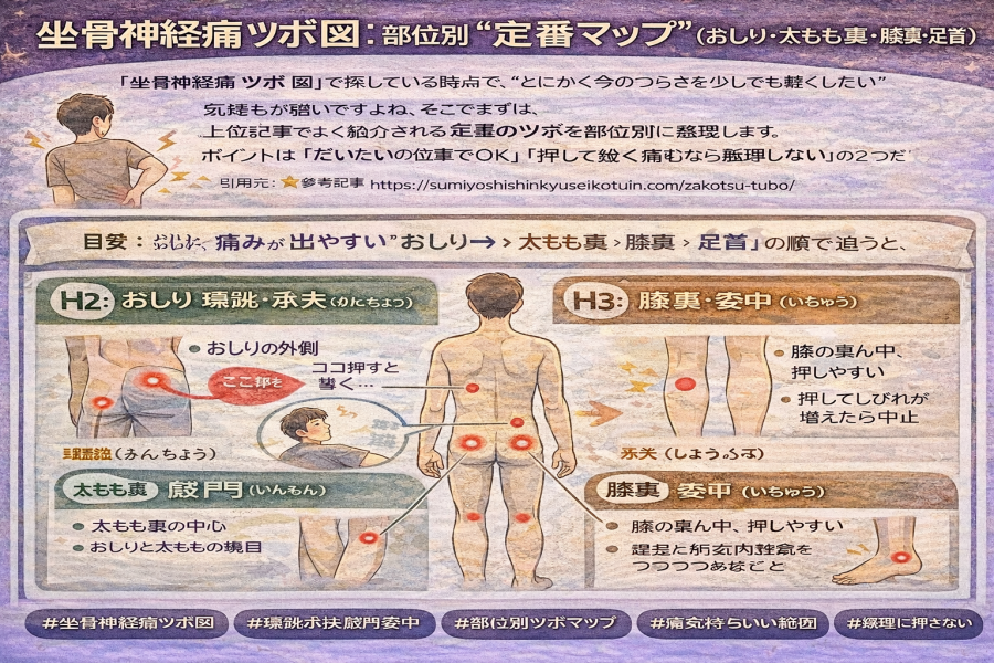 「坐骨神経痛 ツボ 図」で探しているときって、“とにかく今のつらさを少しでも軽くしたい”気持ちが強いですよね。そこでまずは、上位記事でよく紹介される定番のツボを部位別に整理します。ポイントは「だいたいの位置でOK」「押して鋭く痛むなら無理しない」の2つだと言われています。図を見るときは、痛みが出やすい“おしり→太もも裏→膝裏→足首”の順で追うと、迷いづらいです。