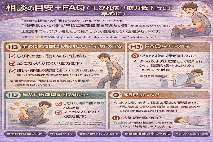 「坐骨神経痛 ツボ 図」を見ながらセルフケアしていても、**“様子見でいい時”と“早めに医療機関を考えたい時”**があると言われています。参考記事でも、ツボは補助として紹介しつつ、無理をしない注意がセットです。まず次のような変化が出たら、ツボ押しを続けて様子を見るより、早めに医療機関で確認する流れが安心だと思います。