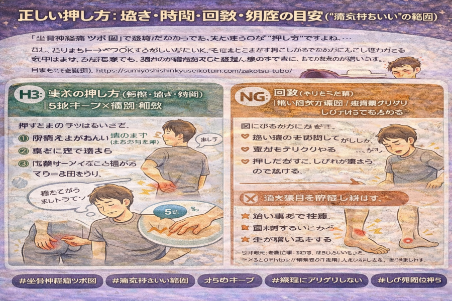 「坐骨神経痛 ツボ 図」で場所がわかっても、次に迷うのが“押し方”ですよね。ここ、やり方ひとつでラクにもなるし、逆にしんどくなることもあると言われています。参考記事でも、強さは痛気持ちいい範囲、急がず丁寧に、という流れが強いです。まずは“安全に試す”が正解だと思ってください。