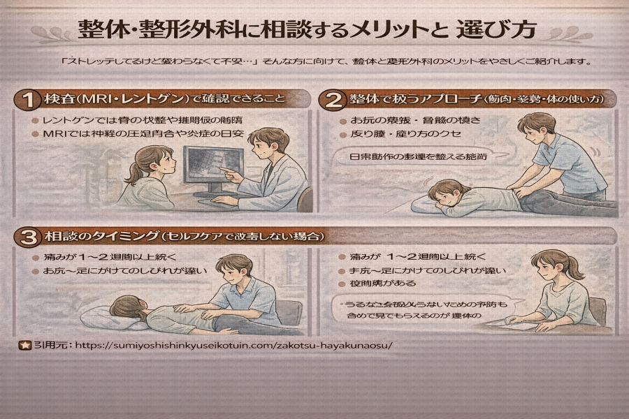 こうした迷いは坐骨神経痛の方によくある悩みの一つです。参考記事でも、“まず状態を確認したい場合は整形外科での検査が役立つ” と説明されています。