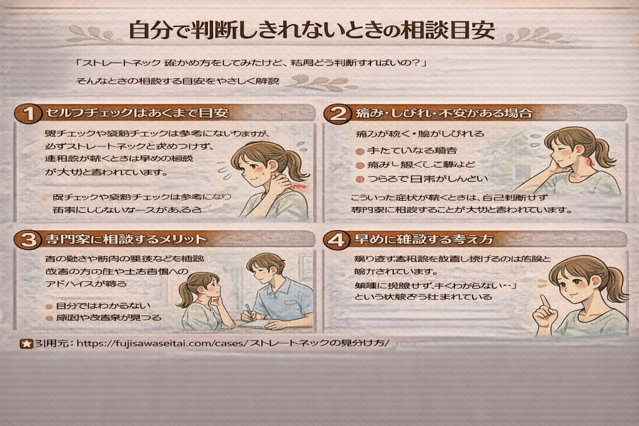 というのも、首まわりの状態は筋肉の硬さ・疲労具合・その日の体調でも見え方が変わりやすいため、セルフチェックだけでは判断しきれないケースがある、と紹介されています。