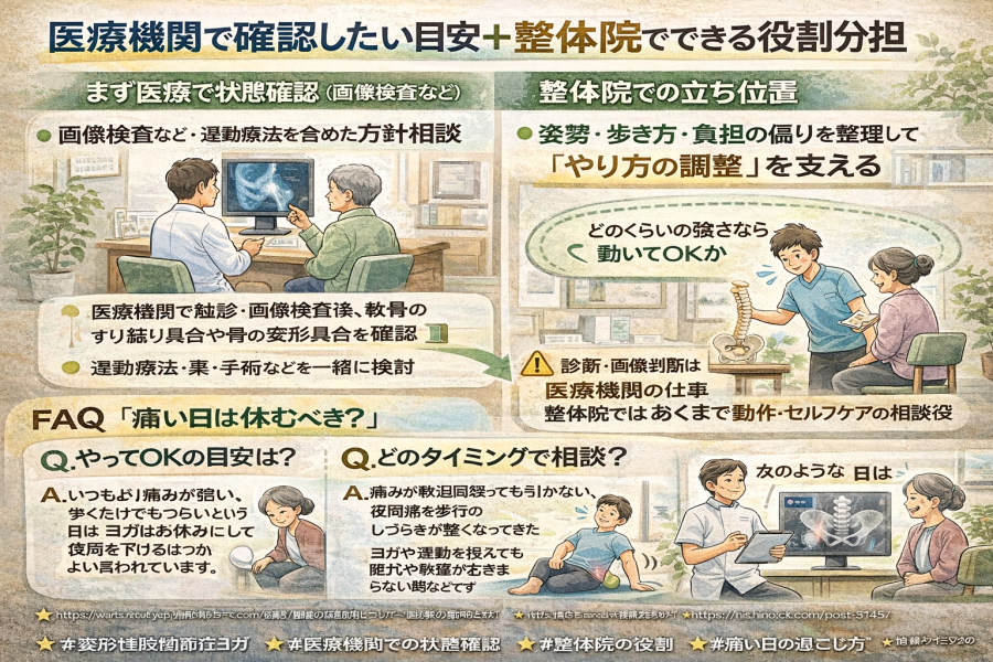 #変形性股関節症ヨガ #医療機関での状態確認 #整体院の役割 #痛い日の過ごし方 #相談タイミングの目安